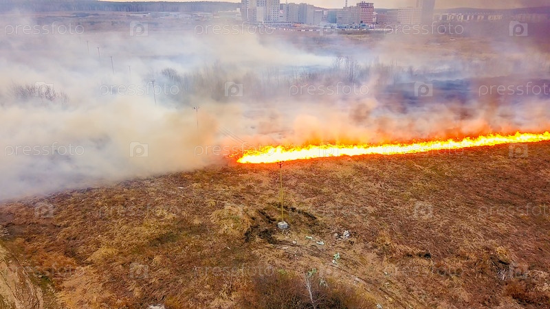 Большой пожар. Горит сухая трава. много дыма. Екатеринбург, Россия, Из Дрона