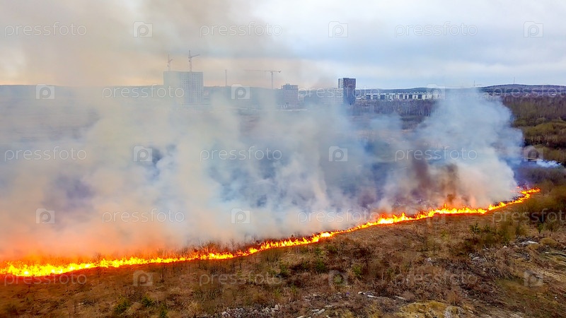 Большой пожар. Горит сухая трава. много дыма. Екатеринбург, Россия, Из Дрона