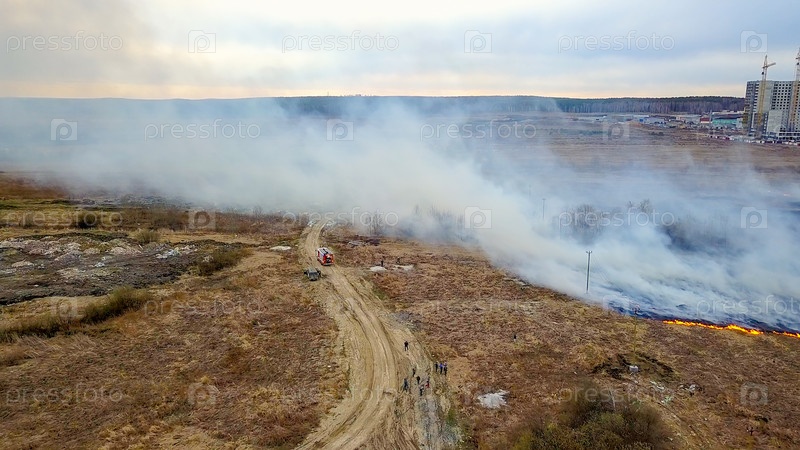 Большой пожар. Горит сухая трава. много дыма. Екатеринбург, Россия, Из Дрона