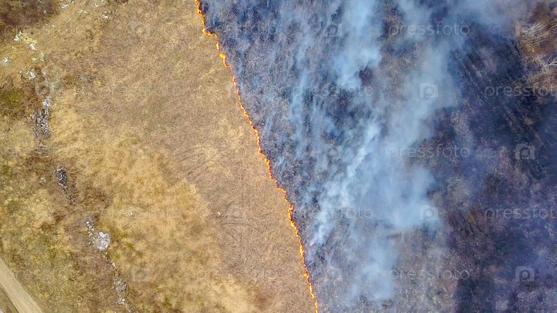 Большой пожар. Горит сухая трава. много дыма. Екатеринбург, Россия, Из Дрона