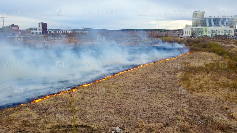 Большой пожар. Горит сухая трава. много дыма. Екатеринбург, Россия, Из Дрона