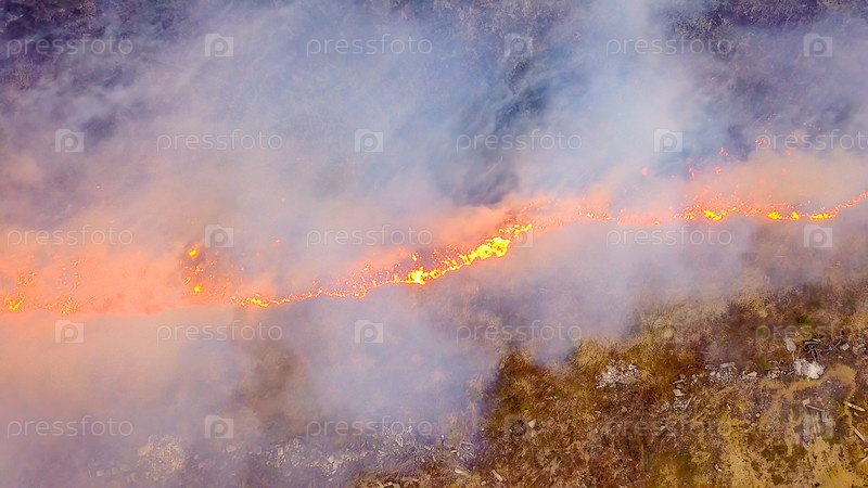 Большой пожар. Горит сухая трава. много дыма. Екатеринбург, Россия, С Дрона, СЪЕМКА ГОЛОВЫ НАД