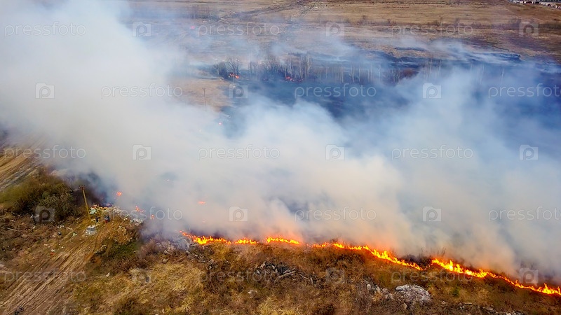 Большой пожар. Горит сухая трава. много дыма. Екатеринбург, Россия, Из Дрона