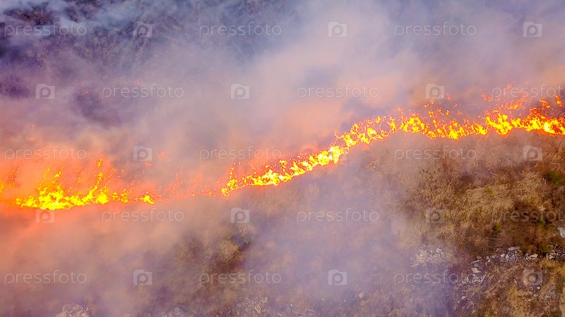 Большой пожар. Горит сухая трава. много дыма. Екатеринбург, Россия, С Дрона, СЪЕМКА ГОЛОВЫ НАД