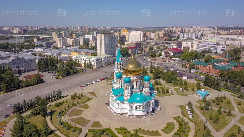 Собор Успения Пресвятой Богородицы, панорамный вид на город. Омск, Россия, Из Дрона