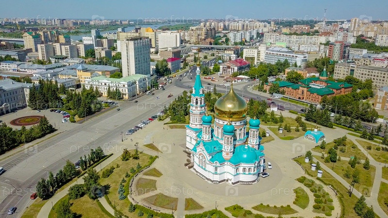 Собор Успения Пресвятой Богородицы, панорамный вид на город. Омск, Россия, Из Дрона