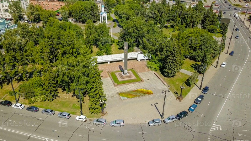 Стела в честь награждения орденами Омской области и города Омска. Парк Павлика Морозова. Омск, Россия, Из Дрона