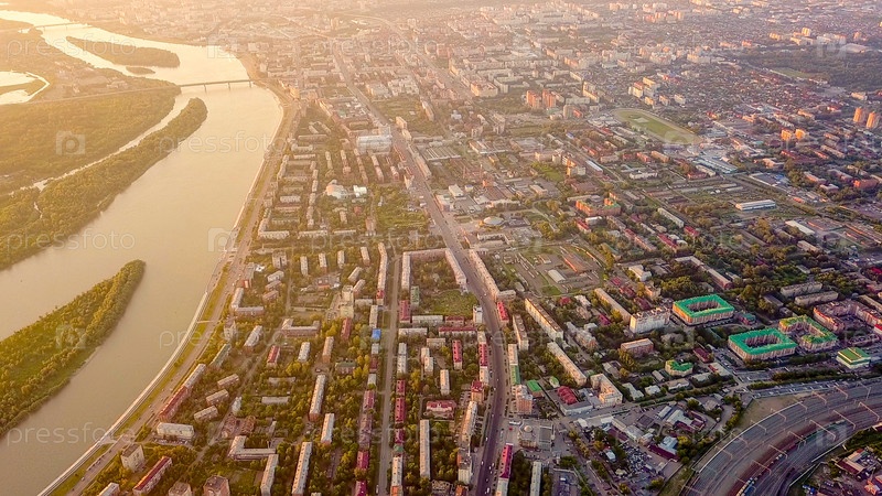 Вид на город Омск и реку Иртыш во время заката. Россия, Из Дрона