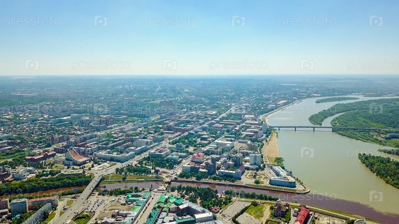 Слияние рек Иртыш и Омь, панорамный вид на город. Омск, Россия, Из Дрона