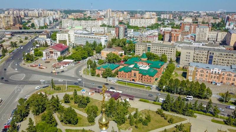 Собор Успения Пресвятой Богородицы, панорамный вид на город. Омск, Россия, Из Дрона
