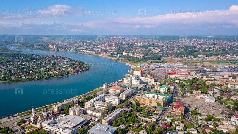 Россия, Иркутск. Панорамный вид на город и реку Ангару с высоты птичьего полета, С Дрона