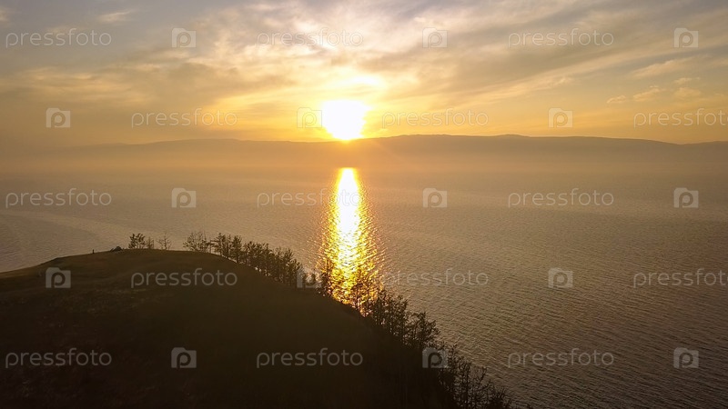 Россия, Озеро Байкал, Остров Ольхон, Закат над бухтой Малого моря, С дрона