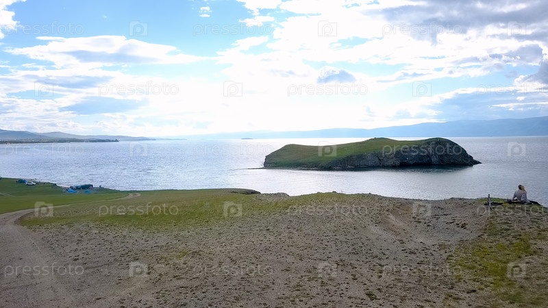 Полет над землей и водой. Россия, Байкал, залив Малое Море. Остров Харанцы. Рядом с островом Ольхон, с дрона