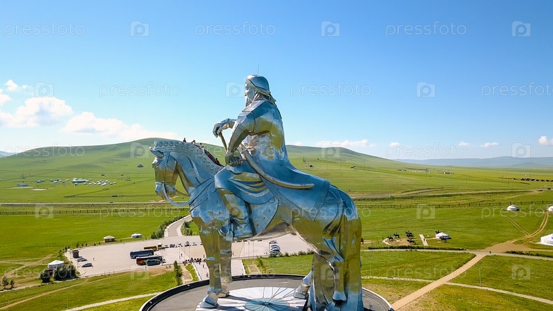 Конная статуя Чингисхана в солнечную погоду. Монголия, Улан-Батор, с дрона