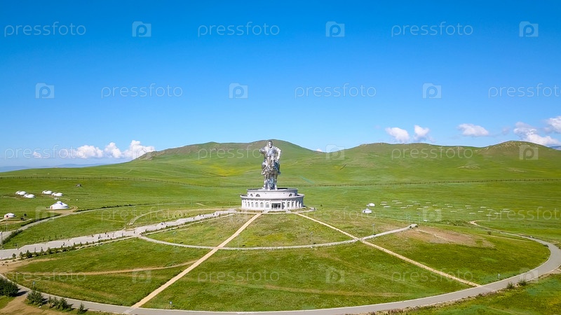 Конная статуя Чингисхана в солнечную погоду. Монголия, Улан-Батор, с дрона