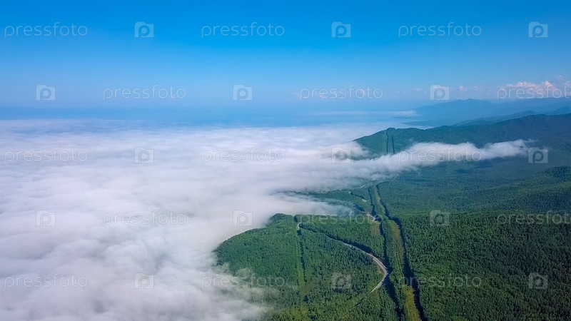 Полет над облаками. Побережье Байкала. Горы, покрытые лесом. Россия, с дрона