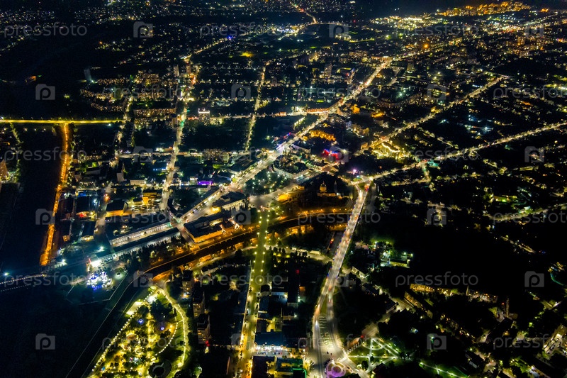 Орел, Россия. Огни ночного города. Ночная панорама центра города. С высоты птичьего полета
