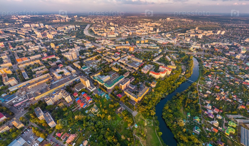 Орел, Россия. Панорама города во время заката Пасмурная погода. С высоты птичьего полета