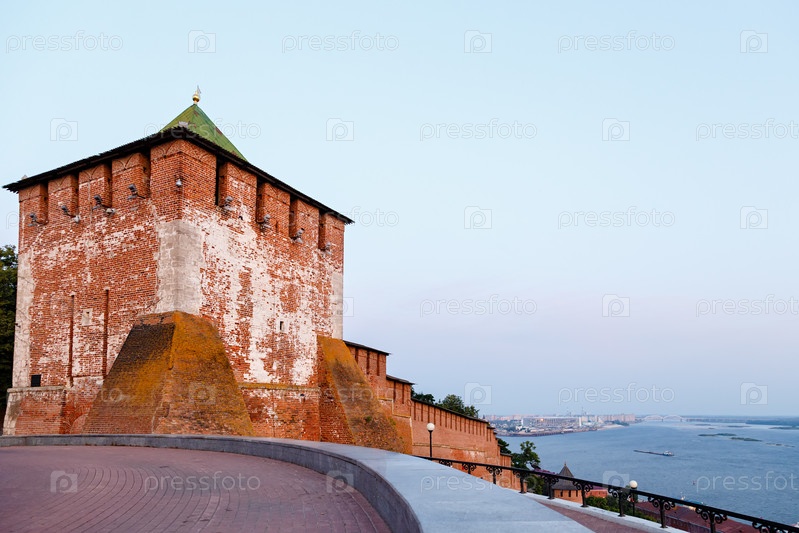 Башня и стена Нижегородского Кремля. Панорамный вид на Волгу с футбольным стадионом. Россия