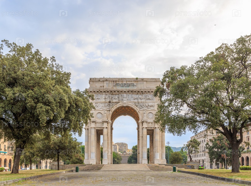 В Италии, Генуя. Арка Победы. Текст на английском языке: ГЕНУЯ. СИНОВИЯ, ПРОБЛЕЖНОСТЬ РОДОНЫ, ЗАГРАЗОВАТЕЛЬСТВА НА ЛЕСЕ И МОРЕ В ЦЕРКУ В Славе Веков. СПОРТА ОПИСАННАЯ. MCMXV-MCMXVIII