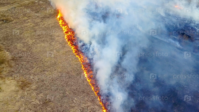 Большой пожар. Горит сухая трава. много дыма. Екатеринбург, Россия, Из Дрона