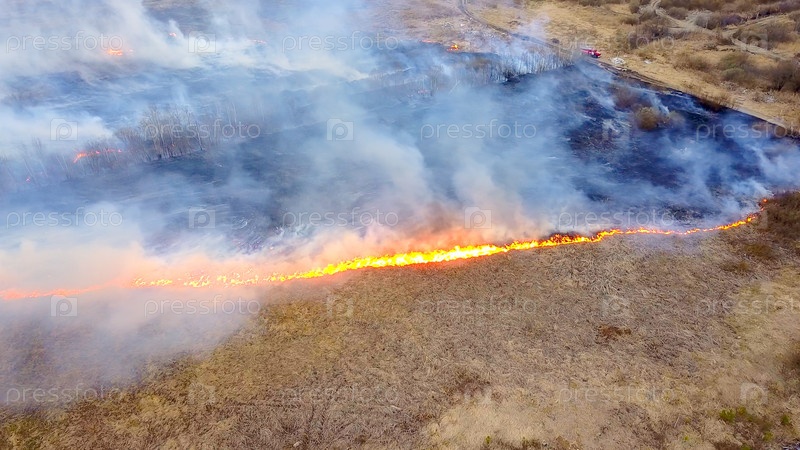 Большой пожар. Горит сухая трава. много дыма. Екатеринбург, Россия, Из Дрона