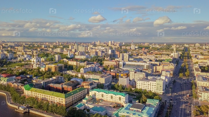 Набережная центрального пруда и Плотинки. Исторический центр города Екатеринбурга, Россия, Из Дрона