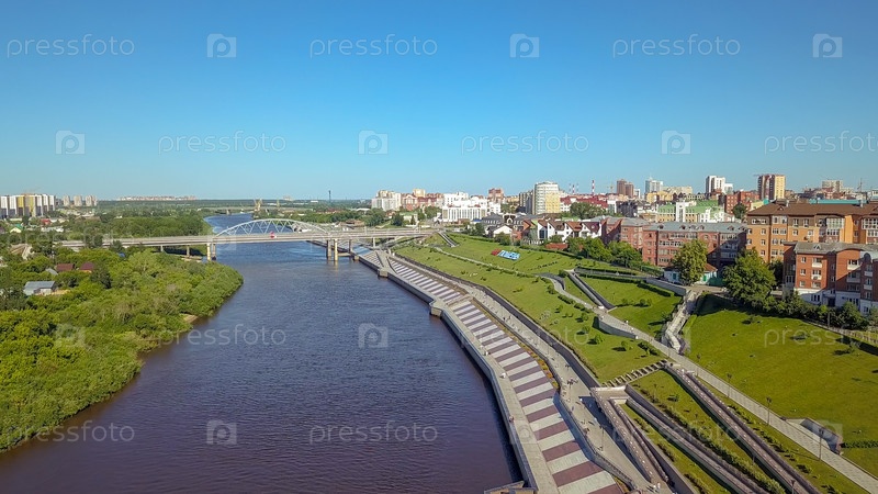 Город Тюмень, набережная реки Туры, автомобильный мост Челюскинцев.Россия, Текст на русском языке - 432 TYUMEN, From Dron