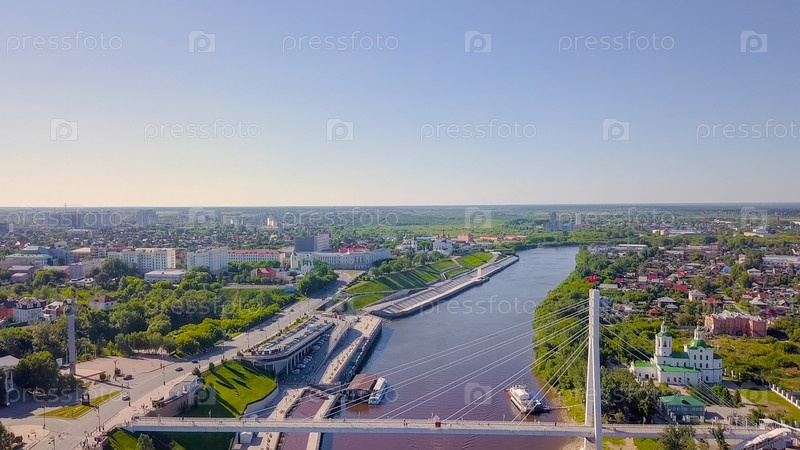 Город Тюмень, Набережная реки Туры, Мост Влюбленных. Россия, на русском тексте - ТЮМЕНЬ, От Дрон