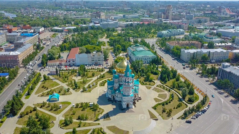 Собор Успения Пресвятой Богородицы, панорамный вид на город. Омск, Россия, Из Дрона