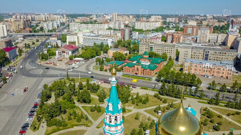 Собор Успения Пресвятой Богородицы, панорамный вид на город. Омск, Россия, Из Дрона