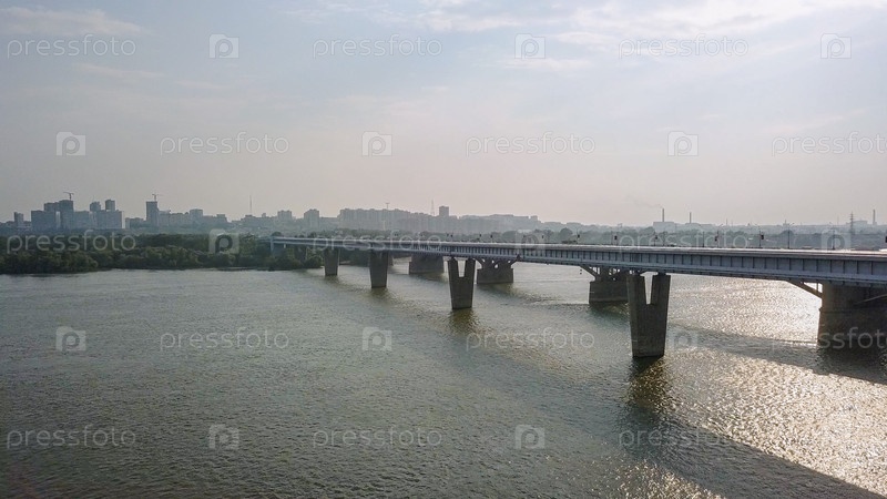 Метро-мост и Коммунальный мост. Панорама города Новосибирска. Вид на реку Обь. Россия, Из Дрона