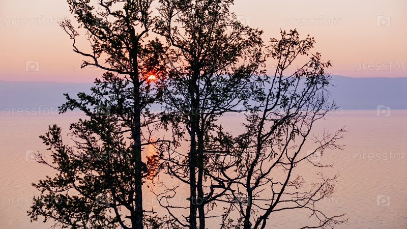 Россия, озеро Байкал, остров Ольхон, закат в ветвях дерева. Вид на залив Малого моря