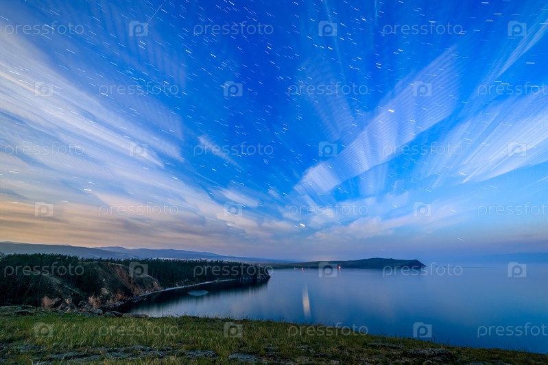 Россия, озеро Байкал, остров Ольхон, облака и звезды в бухте Малого моря. Мыс Саган-Хушун