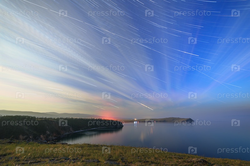 Россия, озеро Байкал, остров Ольхон, облака и звезды в лунную ночь над заливом Малого моря. Длинные затухающие следы от звезд, эхо сквозь облака