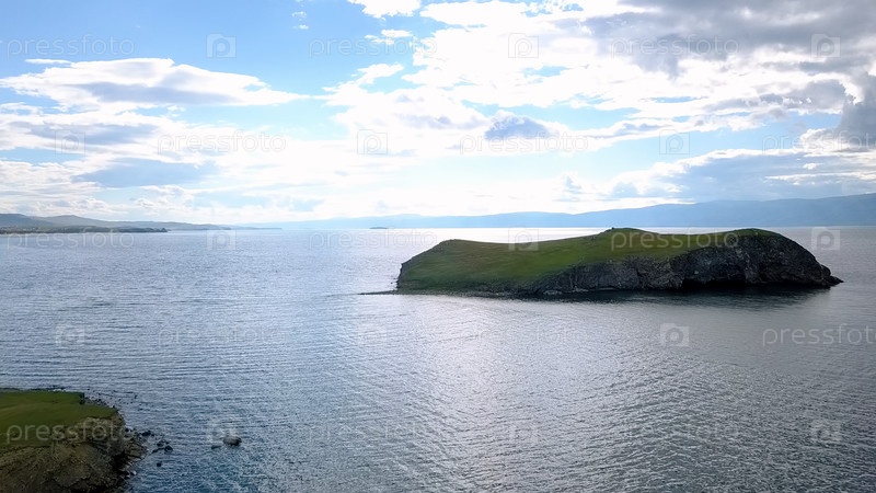 Полет над землей и водой. Россия, Байкал, залив Малое Море. Остров Харанцы. Рядом с островом Ольхон, с дрона
