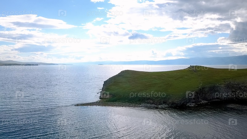 Полет над землей и водой. Россия, Байкал, залив Малое Море. Остров Харанцы. Рядом с островом Ольхон, с дрона
