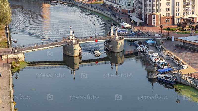 Лодка проходит под Юбилейным мостом. Русла реки Преголи. Калининград, Россия