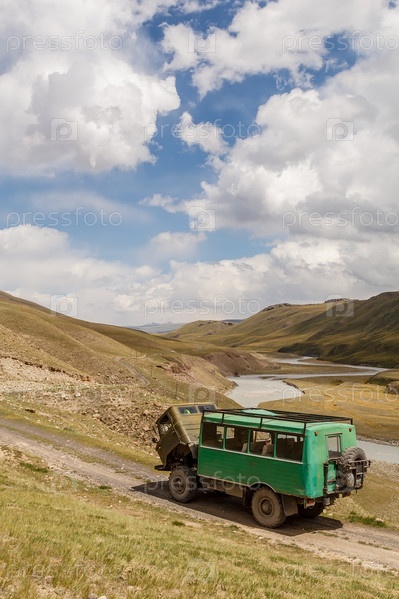 Сломанный грузовик на горной дороге. Азия, Кыргызстан, Тянь-Шань