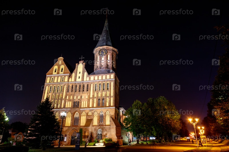 Ночное фото. Центральная часть города Калининграда, Калининградский собор на острове Канта. Россия