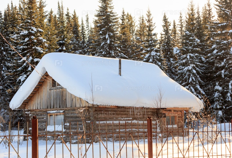 Деревянный домик в зимнем еловом лесу