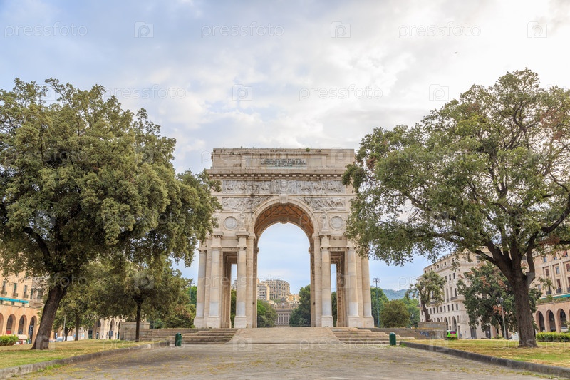 В Италии, Генуя. Арка Победы. Текст на английском языке: ГЕНУЯ. СИНОВИЯ, ПРОБЛЕЖНОСТЬ РОДОНЫ, ЗАГРАЗОВАТЕЛЬСТВА НА ЛЕСЕ И МОРЕ В ЦЕРКУ В Славе Веков. СПОРТА ОПИСАННАЯ. MCMXV-MCMXVIII