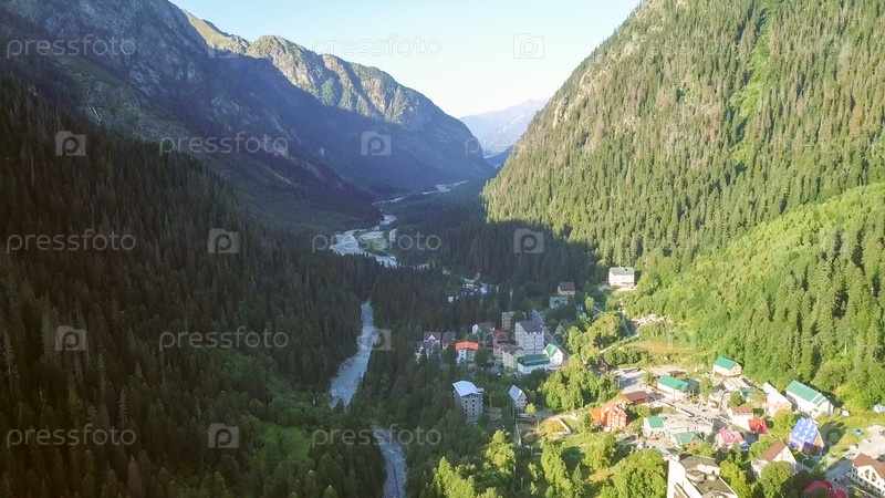 Горная деревня. Полет в горах. Домбайская Поляна, Карачаево-Черкесия, Северный Кавказ. Россия