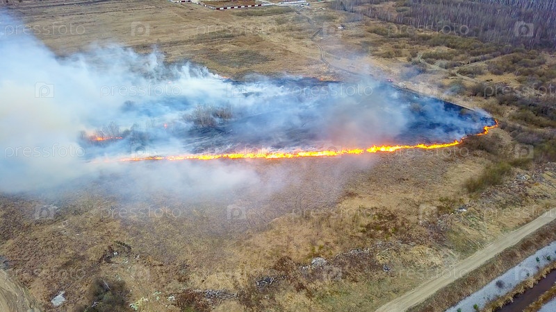 Большой пожар. Горит сухая трава. много дыма. Екатеринбург, Россия, Из Дрона