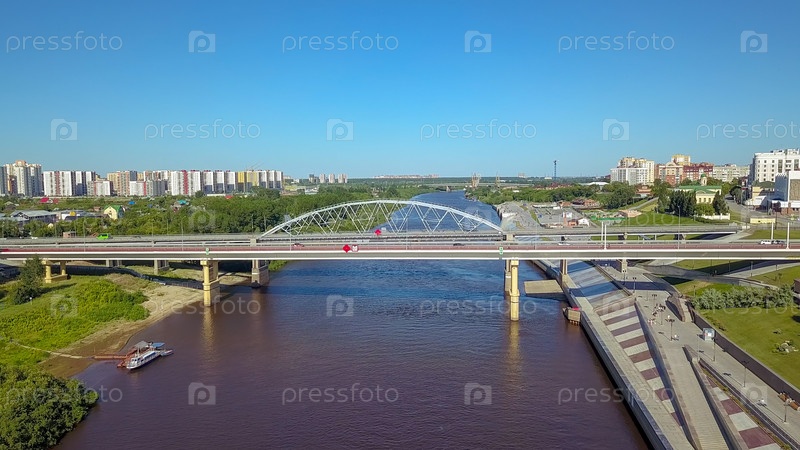 Город Тюмень, набережная реки Туры, автомобильный мост Челюскинцев.Россия, Текст на русском языке - 432 TYUMEN, From Dron