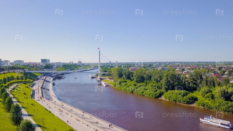 Город Тюмень, Набережная реки Туры, Мост Влюбленных. Россия, на русском тексте - ТЮМЕНЬ, От Дрон