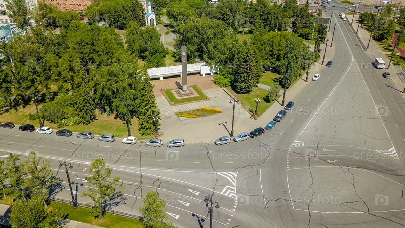 Стела в честь награждения орденами Омской области и города Омска. Парк Павлика Морозова. Омск, Россия, Из Дрона