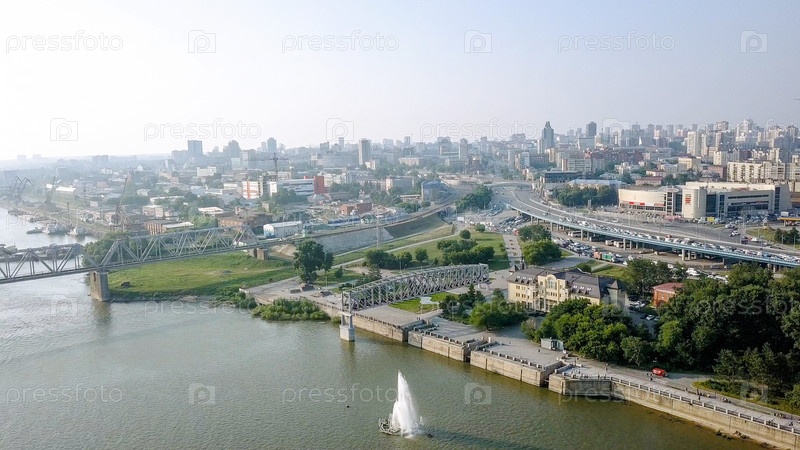 Первый железнодорожный мост в Новосибирске. Панорама города Новосибирска. Вид на реку Обь. Россия, Из Дрона