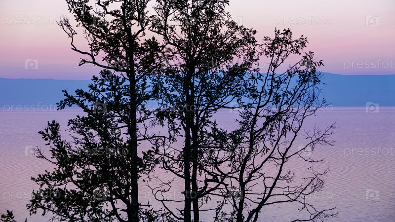 Россия, озеро Байкал, остров Ольхон, закат в ветвях дерева. Вид на залив Малого моря