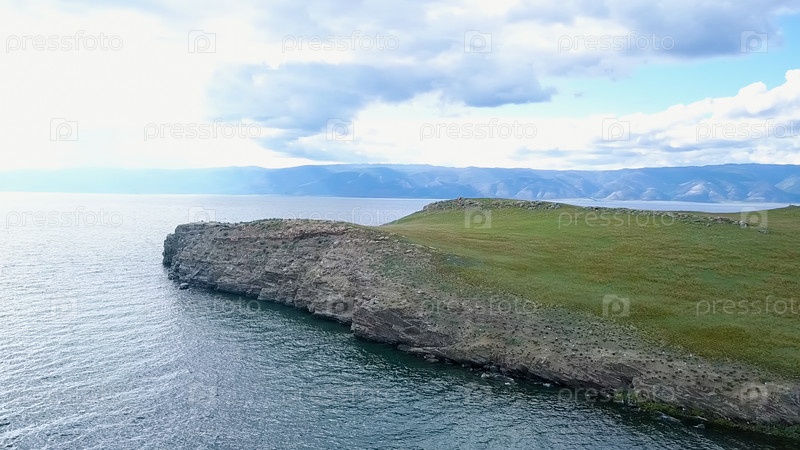 Полет над землей и водой. Россия, Байкал, залив Малое Море. Остров Харанцы. Рядом с островом Ольхон, с дрона